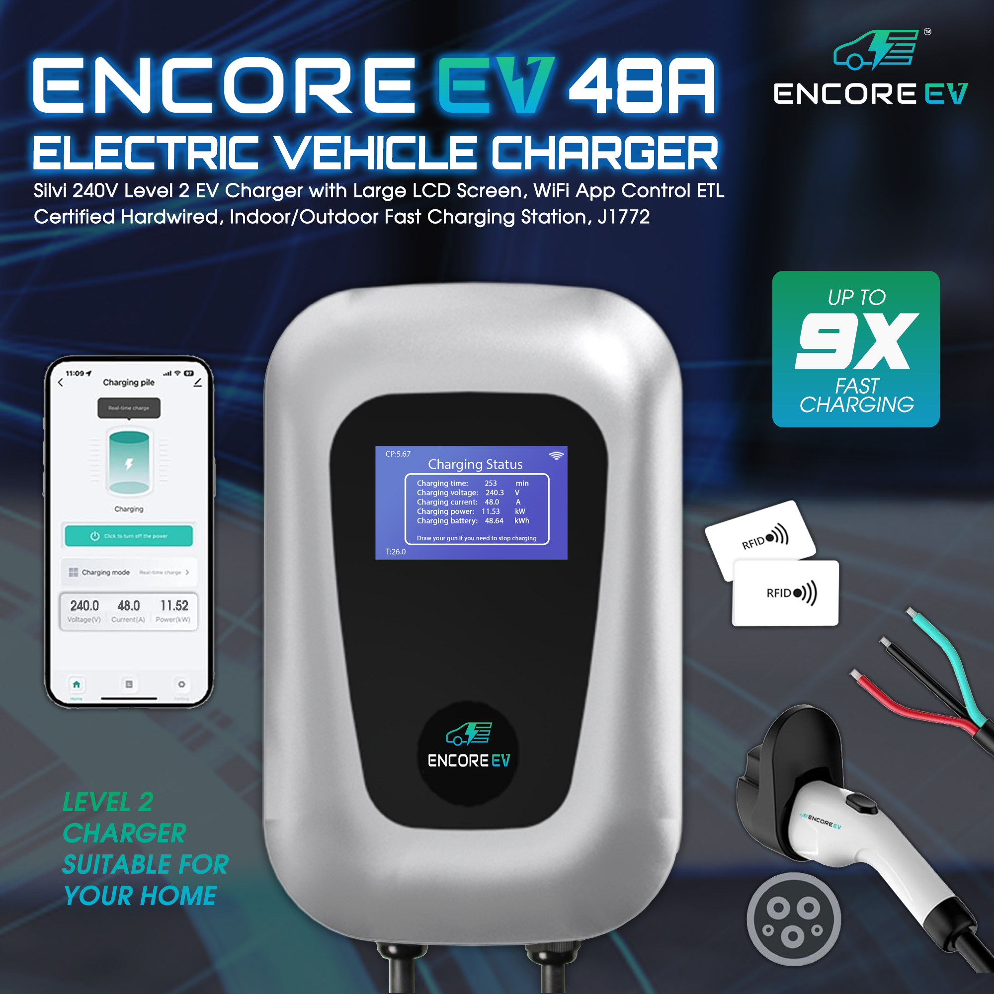 Encore EV 48A Electric Vehicle Charger, Silvi 240V Level 2 EV Charger with Large LCD Screen, WiFi App Control ETL Certified Hardwired, Indoor/Outdoor Fast Charging Station, J1772